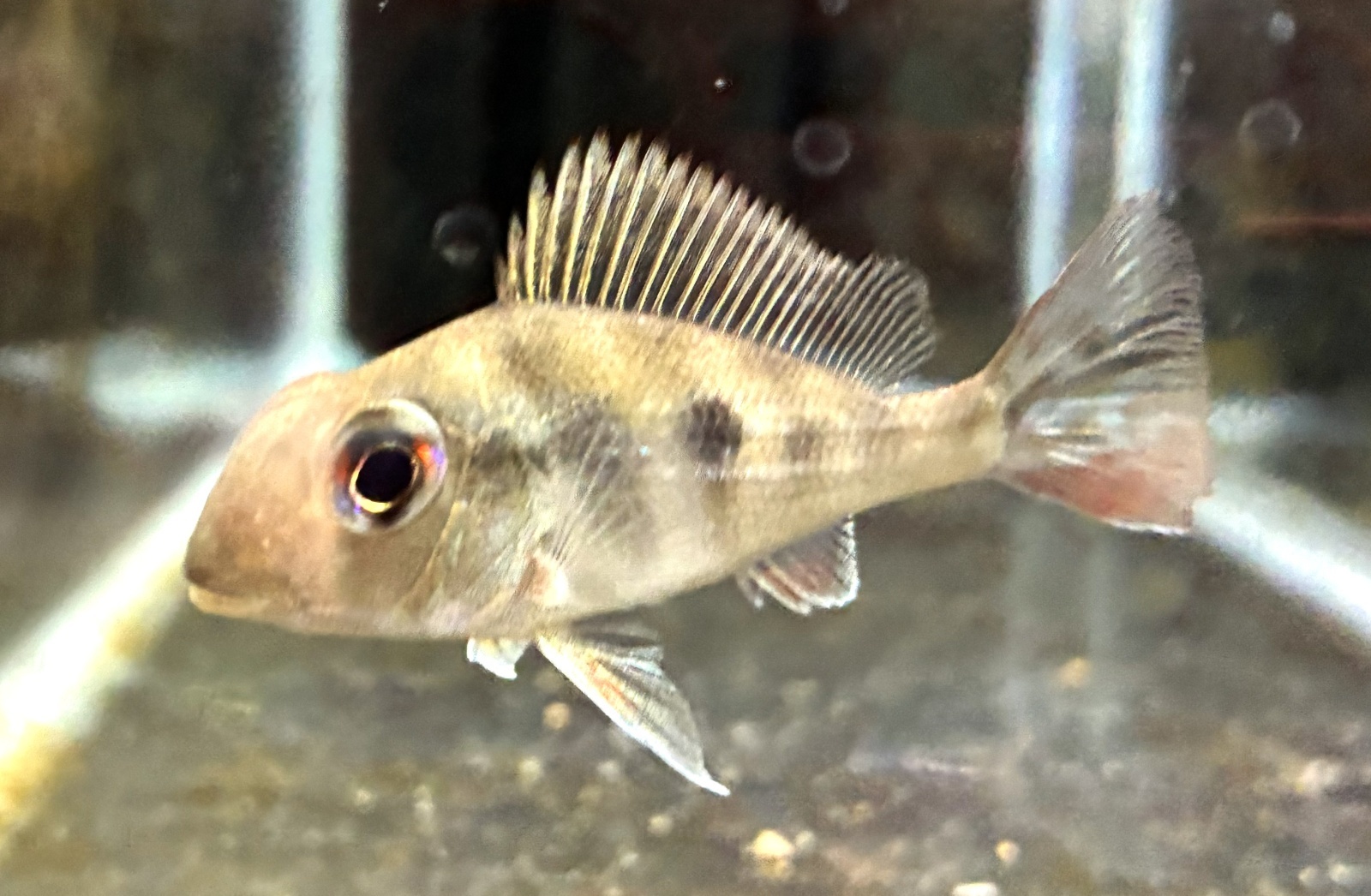 本種は赤みを帯びた各ヒレとメタリックグリーンのストライプが特徴的なゲオファーガスの仲間♪