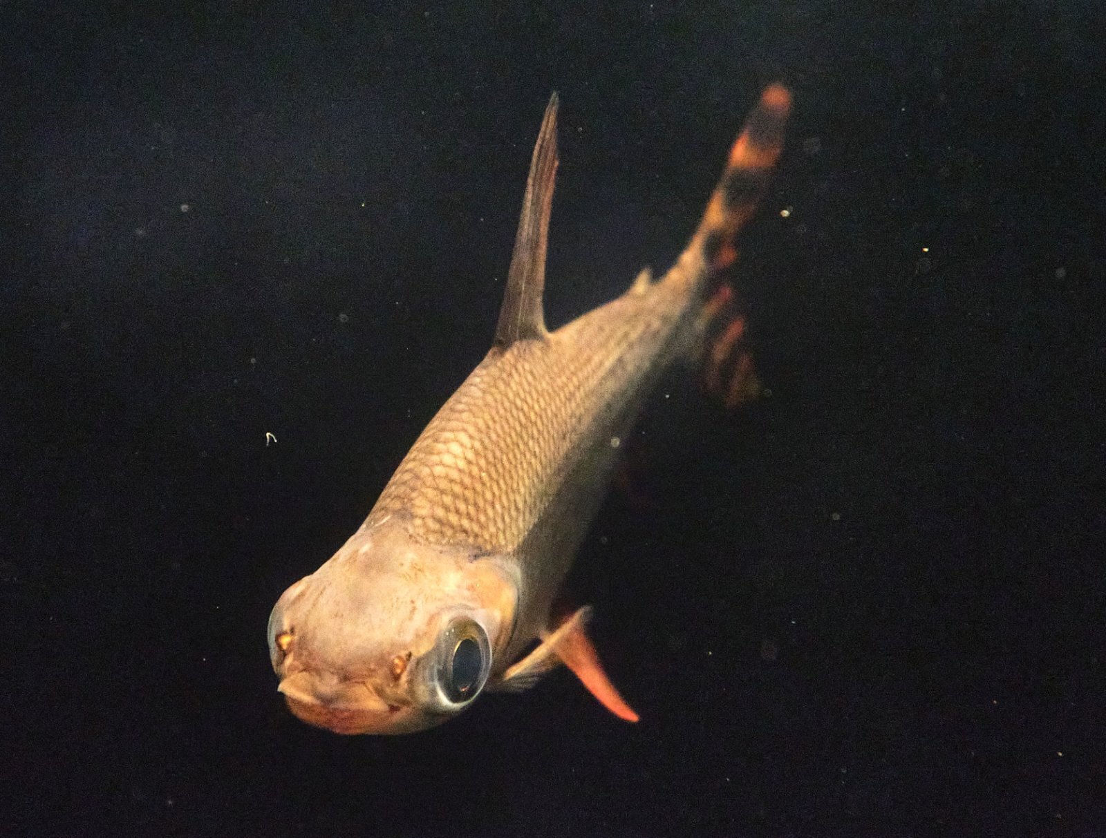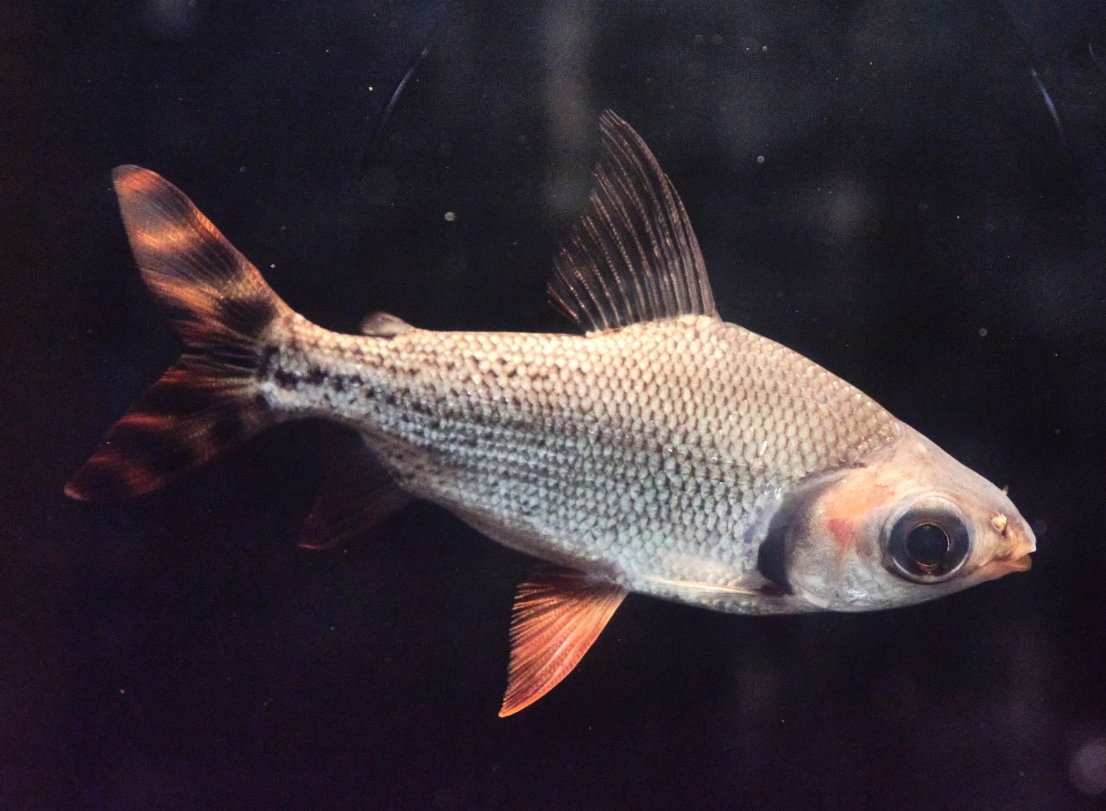 本種は銀色の体に尾鰭の黒バンド模様と腹鰭の赤が映える南米の中型カラシン♪