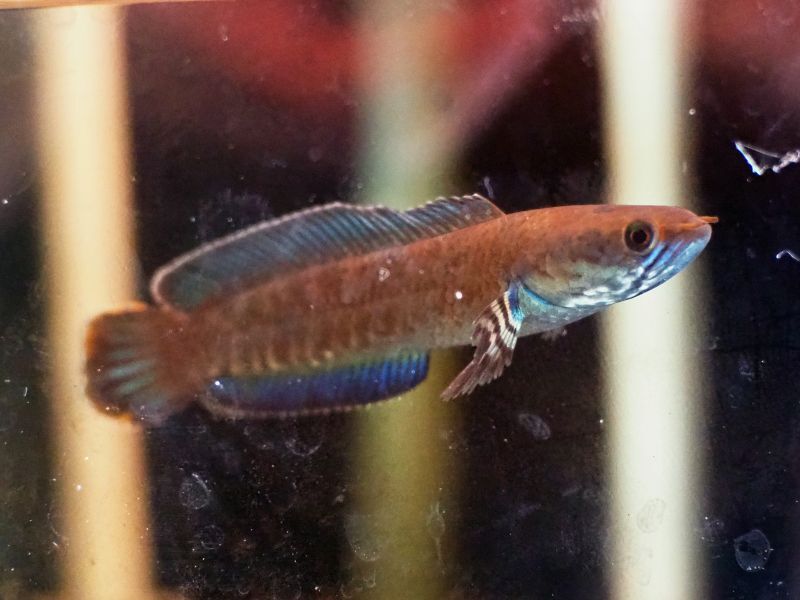 本種は青い背鰭と尻鰭のオレンジ色の縁取りが美しい小型スネークヘッド♪