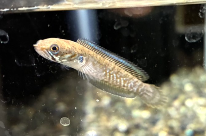 本種は体は青緑に赤の斑模様が入る鮮やかな色彩に鰭先のエッジに赤(オレンジ)がのる小型スネークヘッド♪