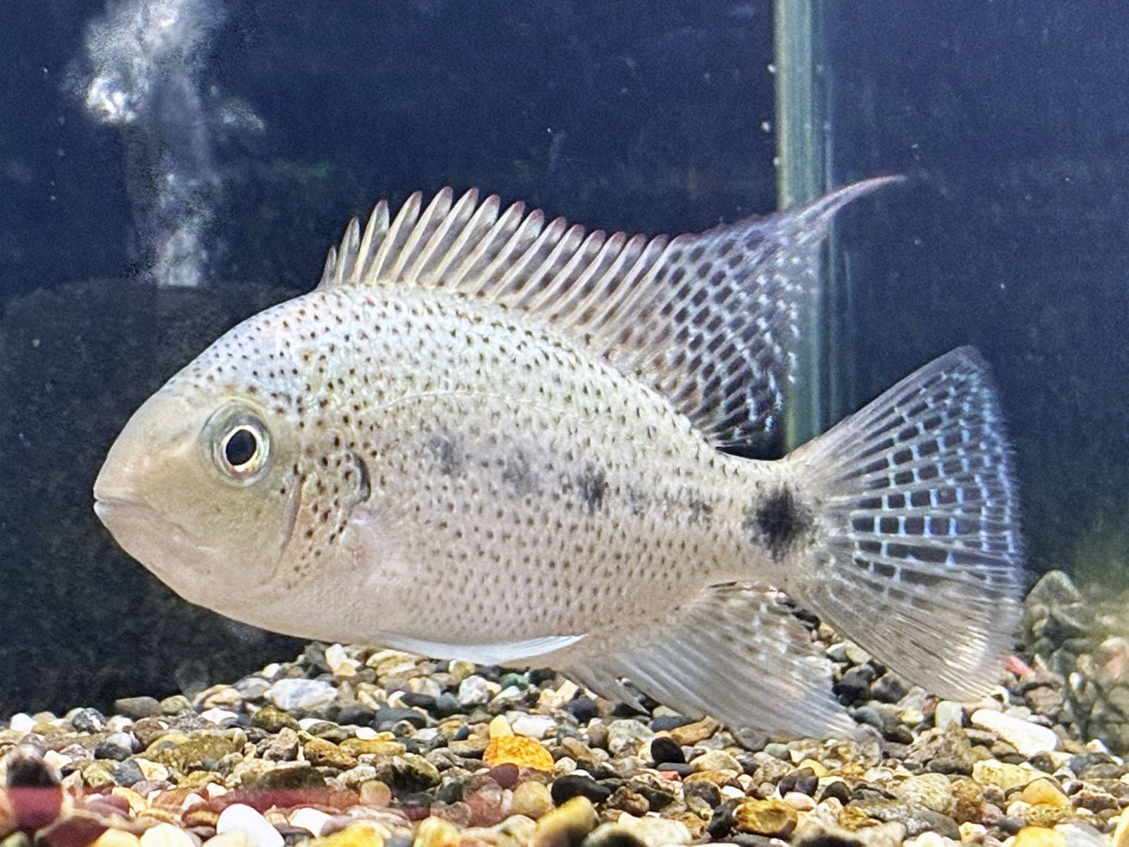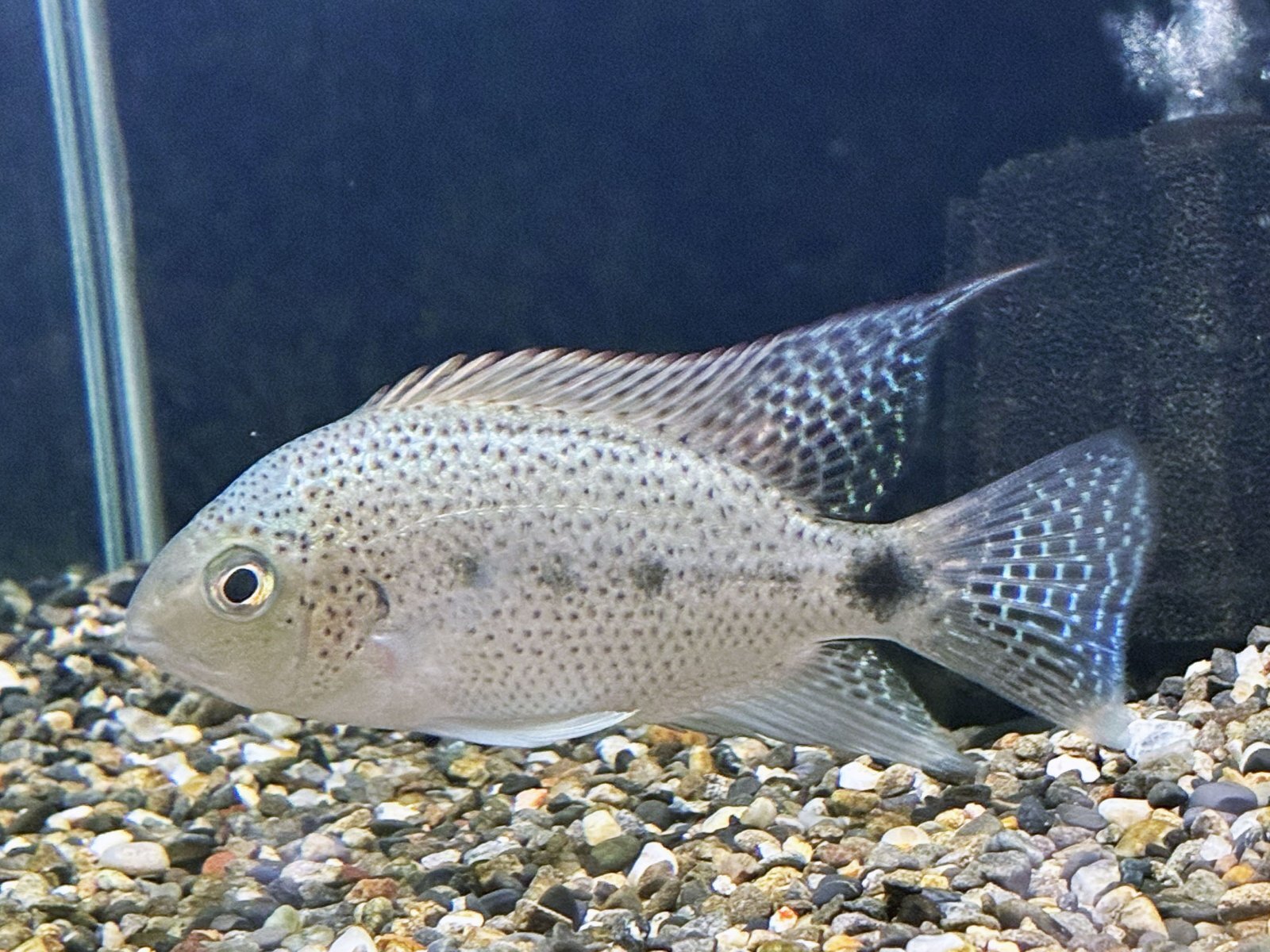 本種は黒いスポットと、白銀の体色が美しい中型シクリッドの仲間♪