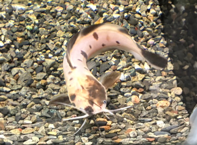 本種はベージュの体色とパンダのように大きな黒斑が特徴的な中型ナマズの仲間♪