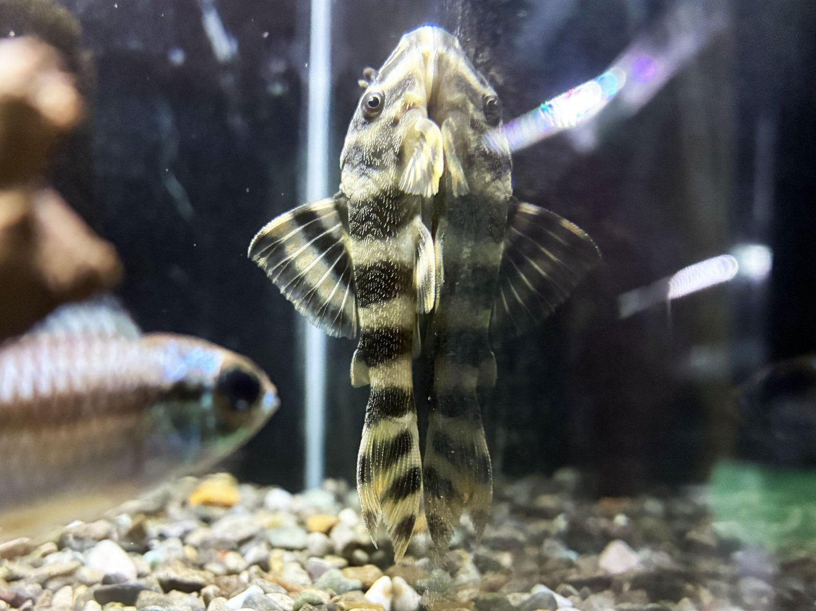 プレコ同士はテリトリーを主張して小競り合いをすることがあるので流木や岩などのシェルターが必要♪