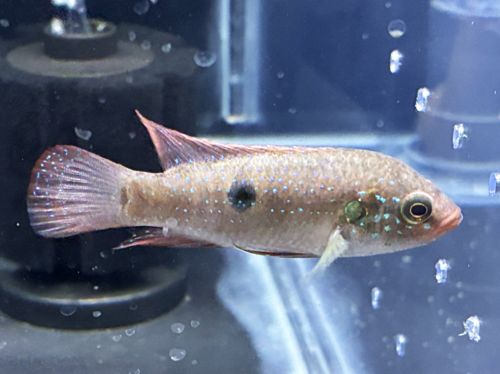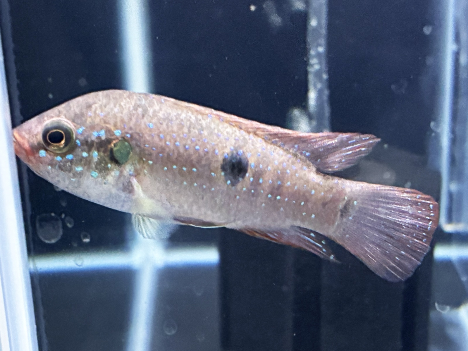 体には黒い斑点模様やブルースポットが入り派手になる個体も♪