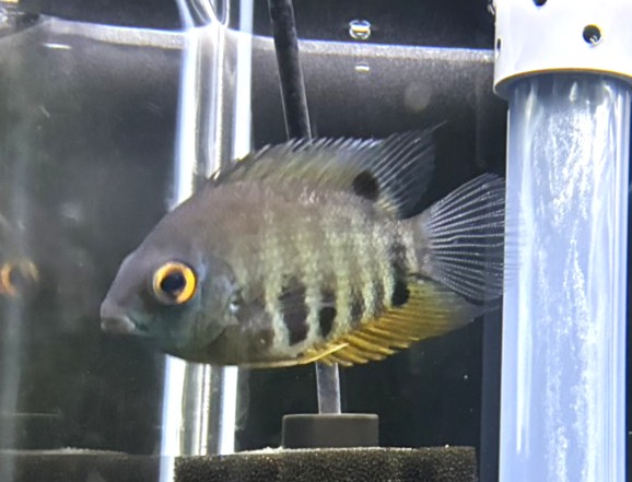 本種は体側に黒のストライプが入り、おでこからエラまで赤い模様が美しい中型シクリッドの仲間♪