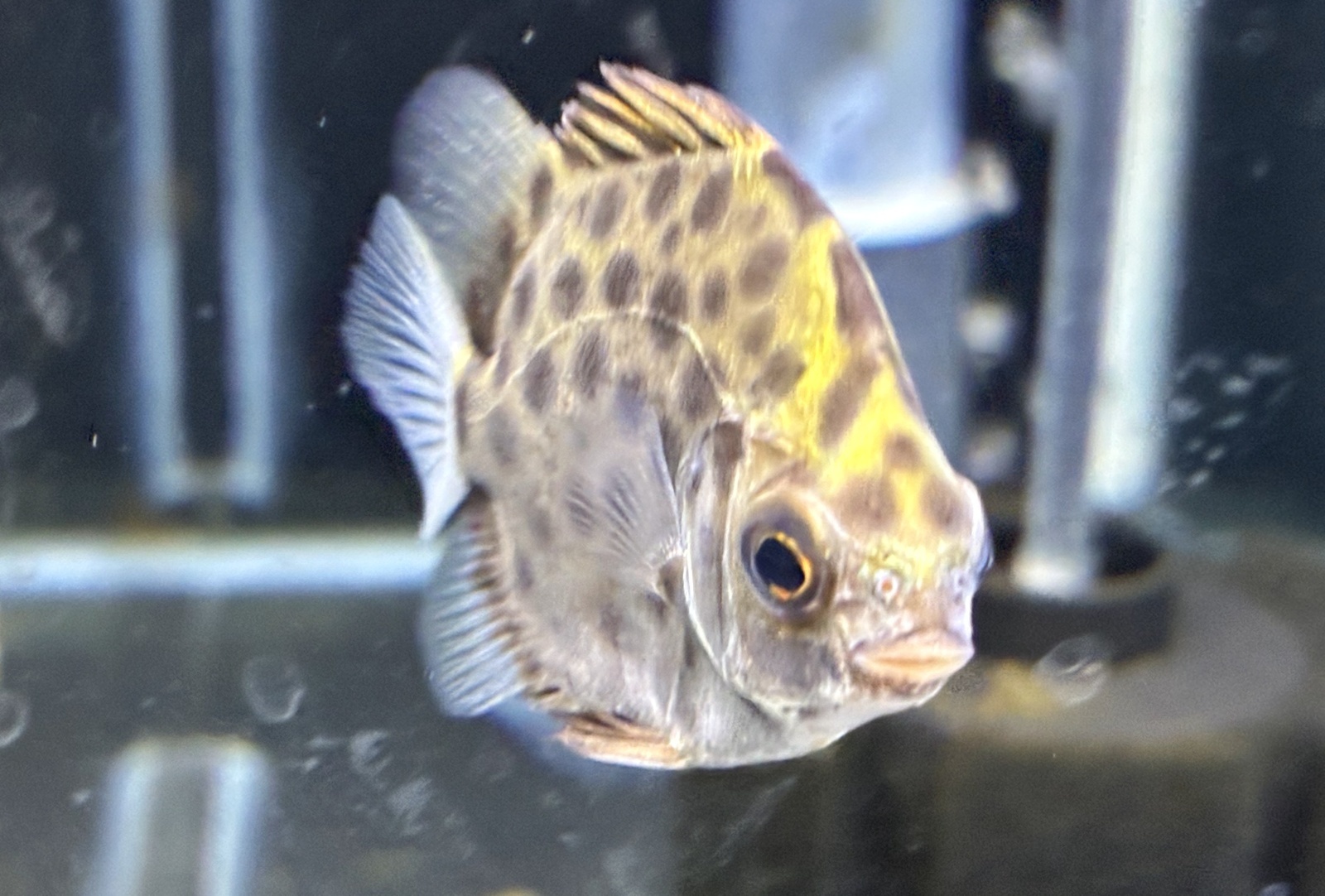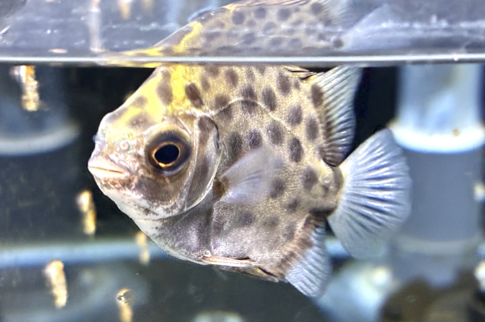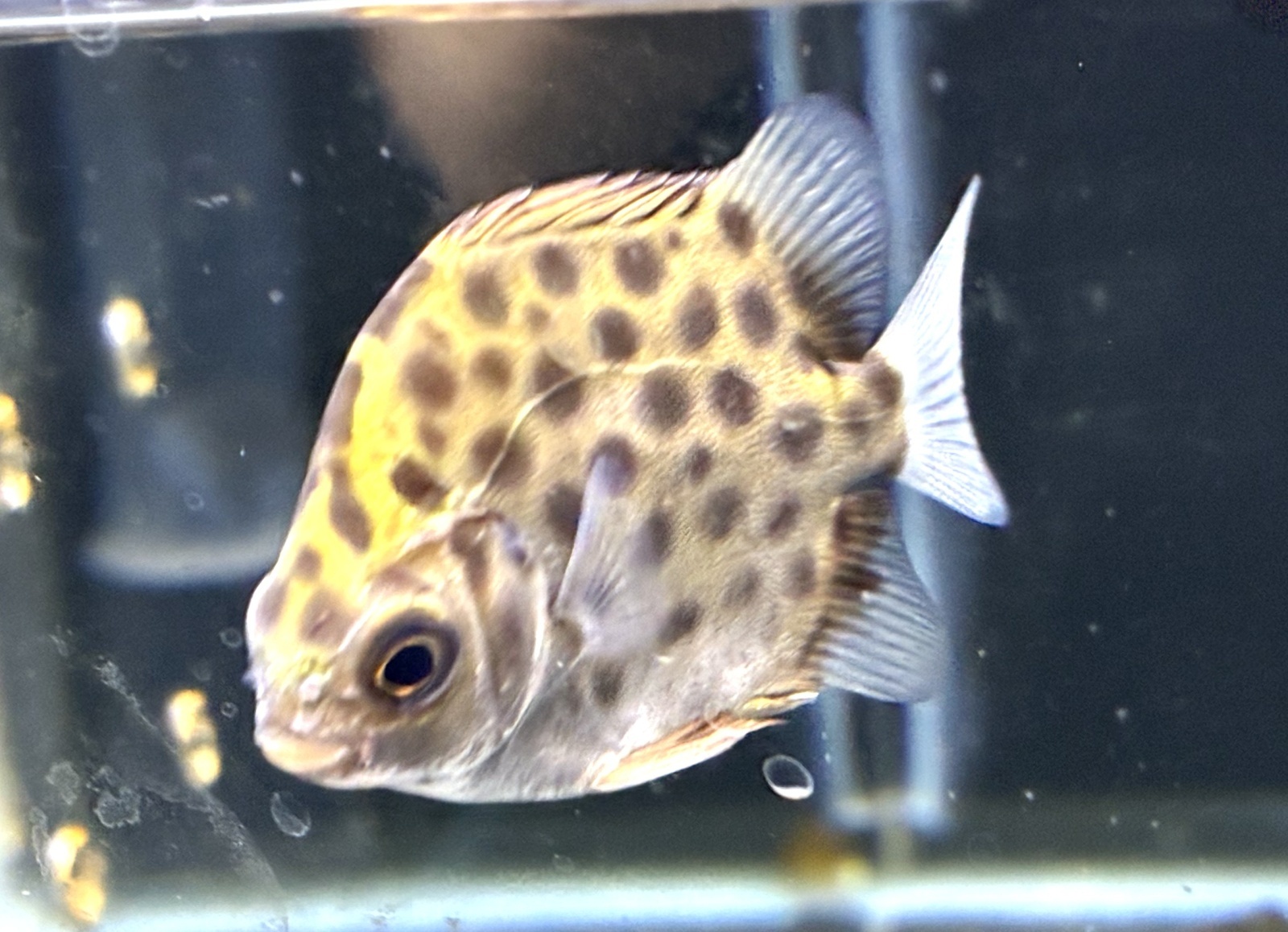 本種は幼魚時にグリーンの体色に黒いスポットが入るスキャットの仲間♪