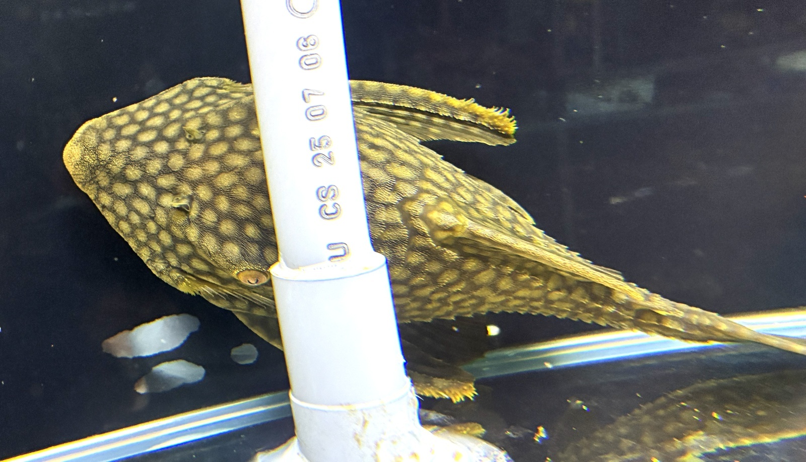 本種は体全体に細かい白〜クリーム色の斑点が密に入る、プレコの仲間♪