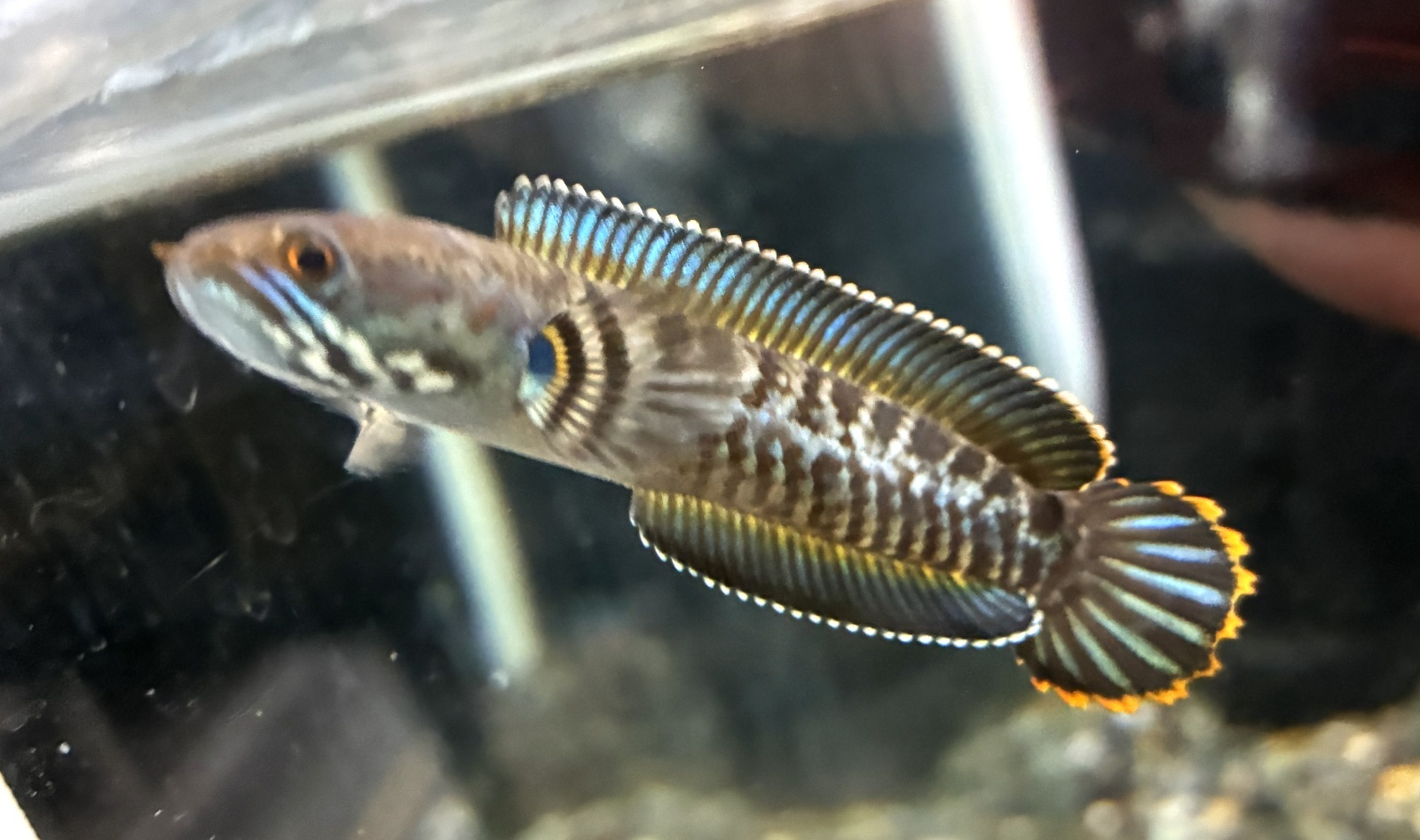 本種は青い背鰭と尻鰭のオレンジ色の縁取りが美しい小型スネークヘッド♪