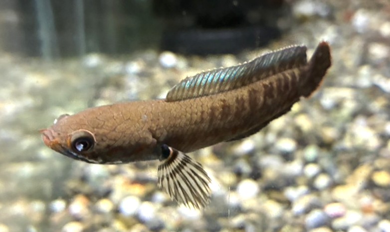本種は青い背鰭と尻鰭のオレンジ色の縁取りが美しい小型スネークヘッド♪