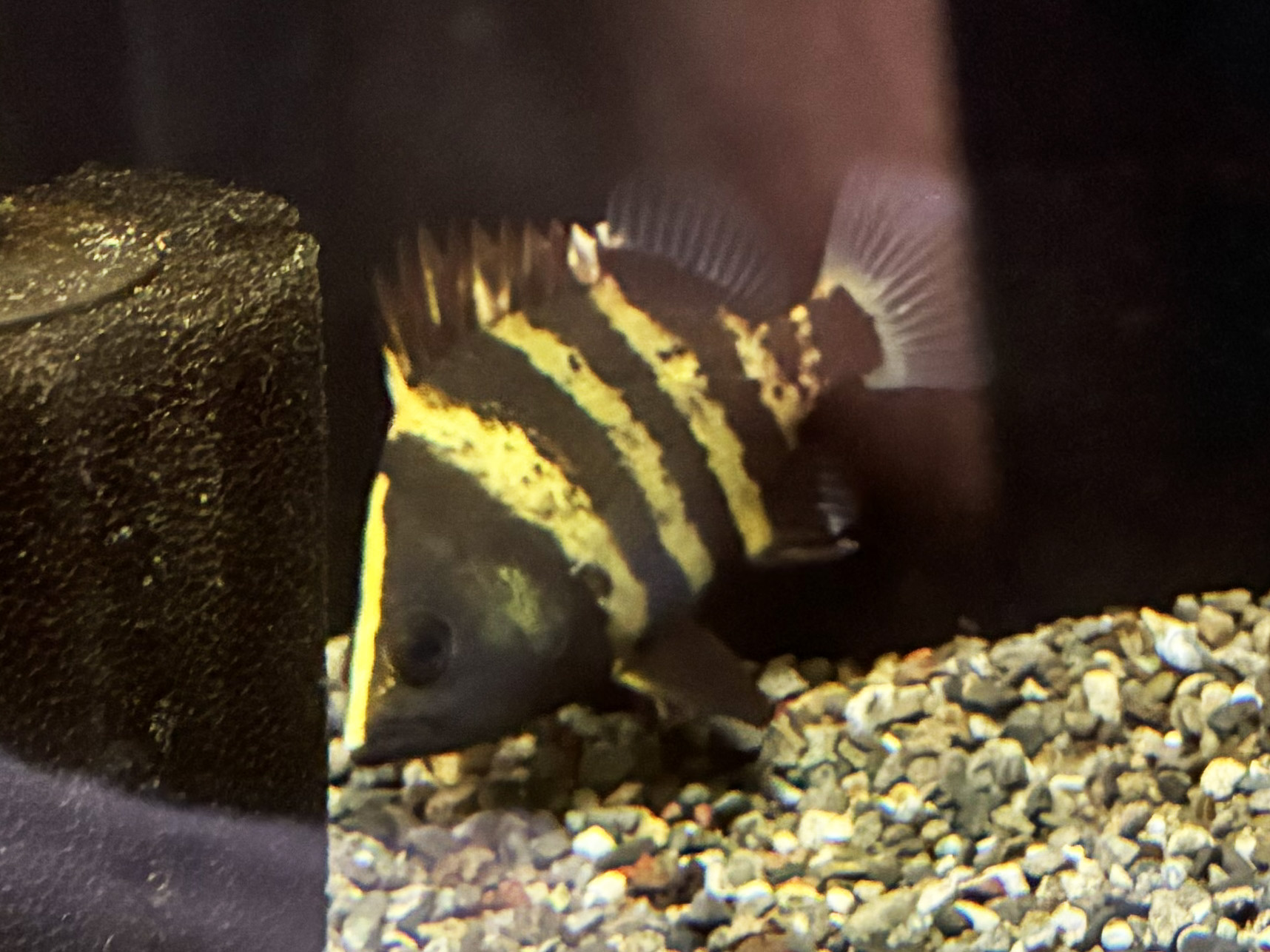 本種は黄色味は明るく黒バンドは成長過程で黒色がにじむように広がり、黒化していく個体が多いダトニオの仲間♪