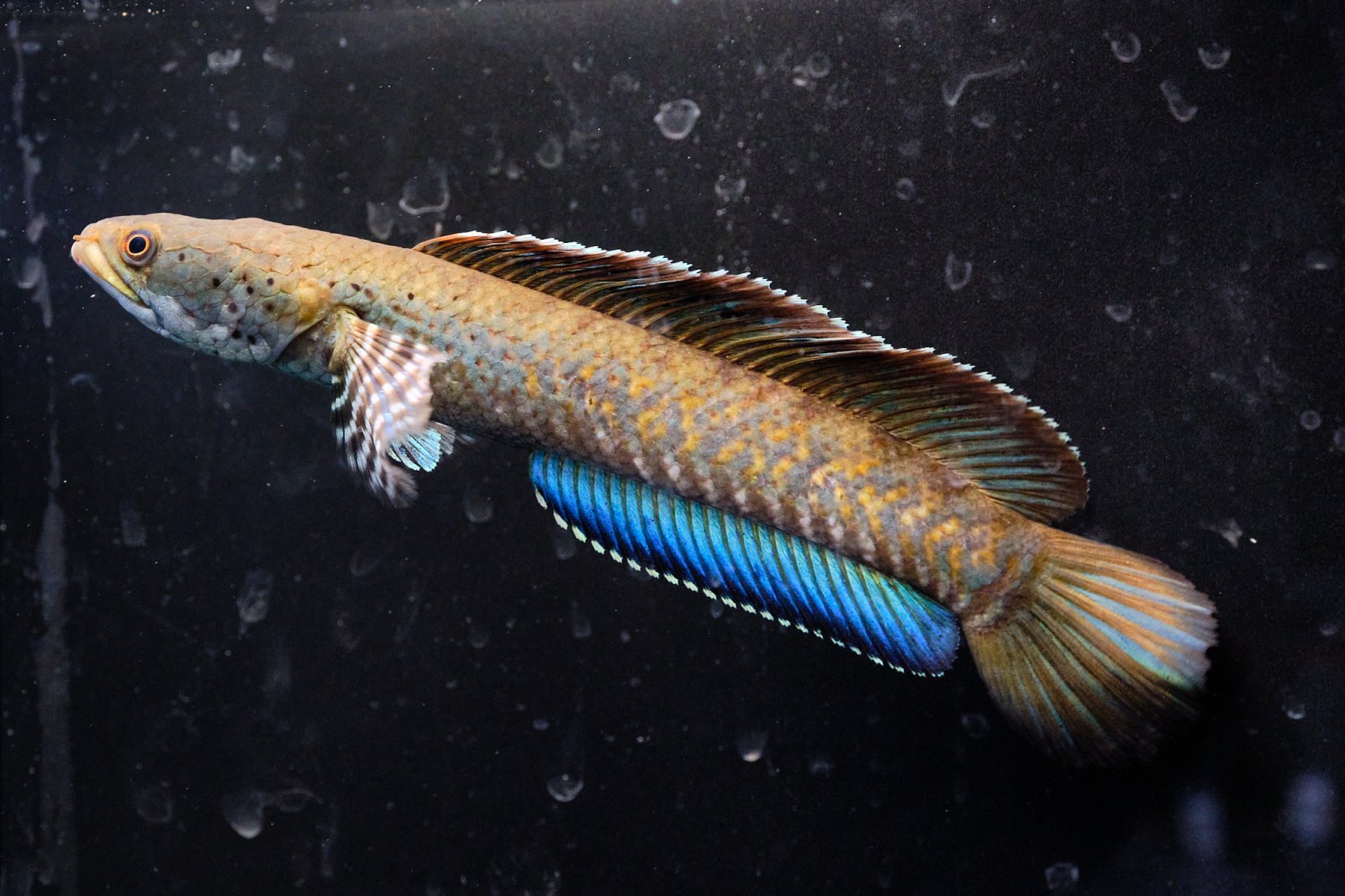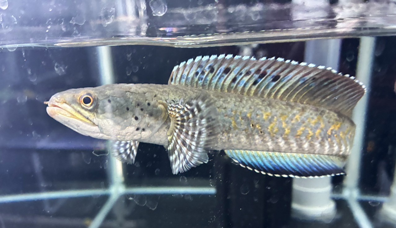 本種は淡いブルーの体色とオレンジのマダラ模様、黒いスポットが美しいスネークヘッドの仲間♪